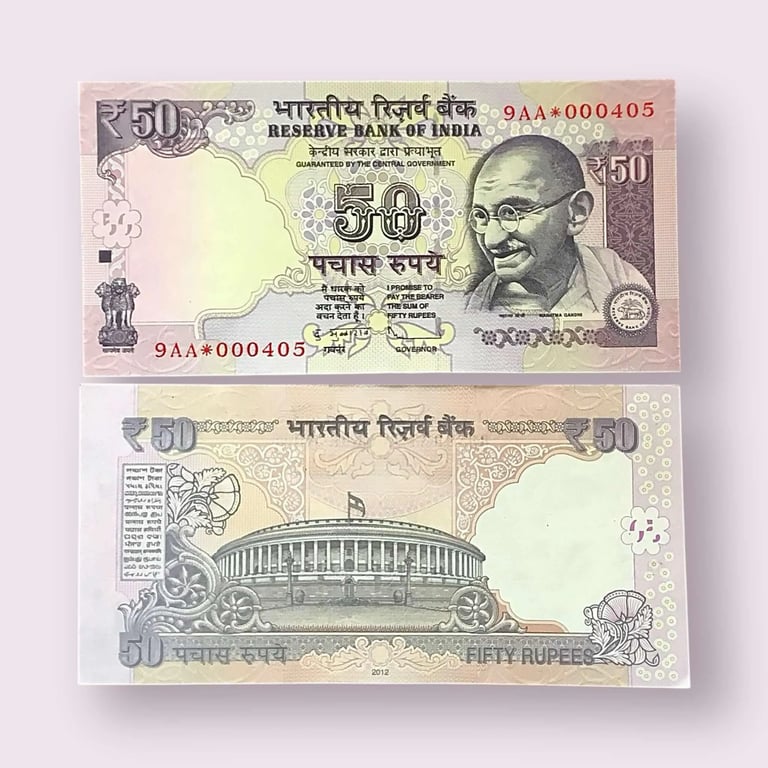 Rs 50 STAR REPLACEMENT LOW SERIAL 000405 Prefix 9AA Signed by D Subbarao Year 2012 Issue Gem Unc