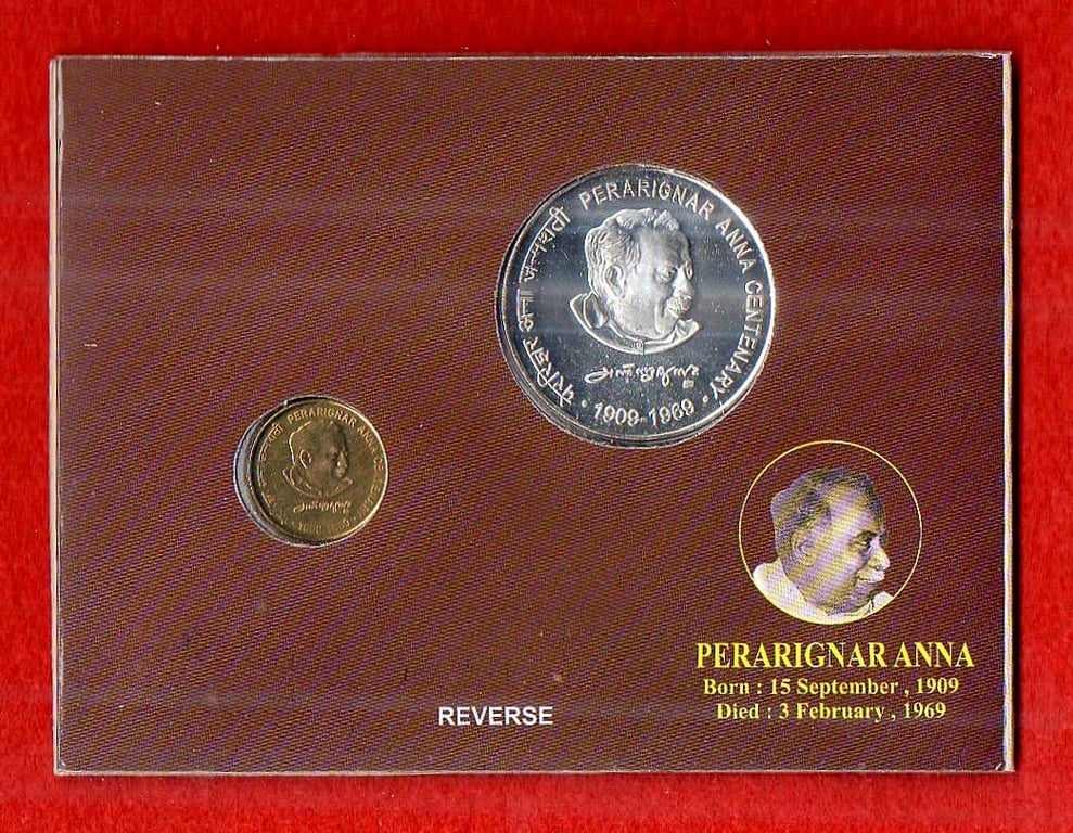 2009 Perarignar Anna Centenary (1909-1969) UNC Coin Set Mint Kolkata Year 2009 Denomination Rs.100, Rs.5