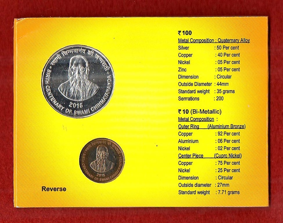 2015 Birth Centenary of Swami Chinmayananda UNC Coin Set Mint Kolkata Year 2015 Denomination Rs.100, Rs.10