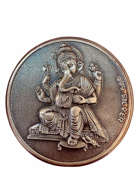 The image shows a 999 silver coin featuring the Hindu god Ganesha. Ganesha is depicted seated, holding his traditional attributes. The coin is round and has a textured surface, with the inscription "999 SILVER" along the edge, indicating its purity. These types of coins are often purchased for religious purposes, gifting, or investment.